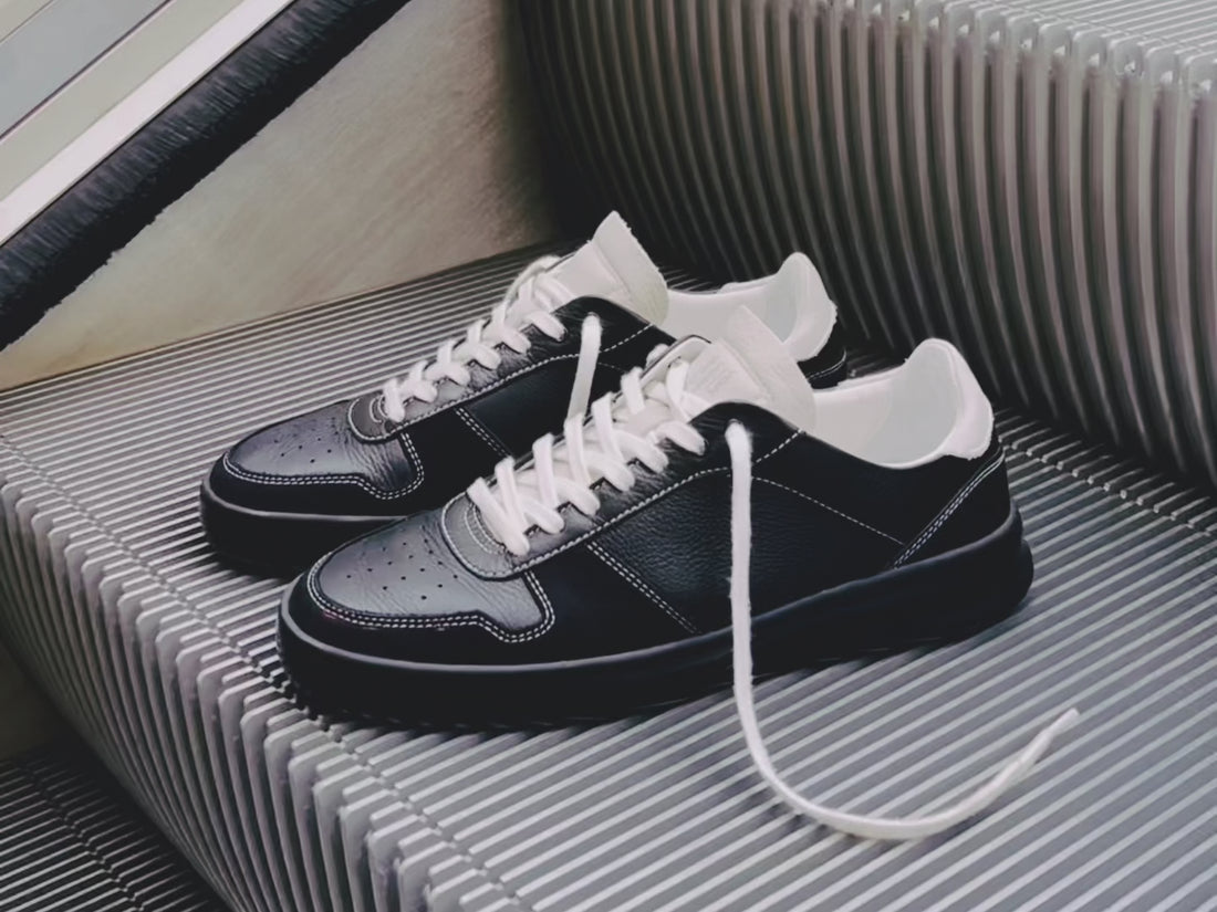 Premium unisex sneaker crafted with the finest tumbled leather combined with black nubuck panels and a white tumbled leather tongue. Featuring bright contrast stitches in white. Sitting on a tonal black dual density TPU outsole, offering an enhanced abrasion resistance. Featuring a contrasting breathable calfskin leather lining and contrasting laces in white.